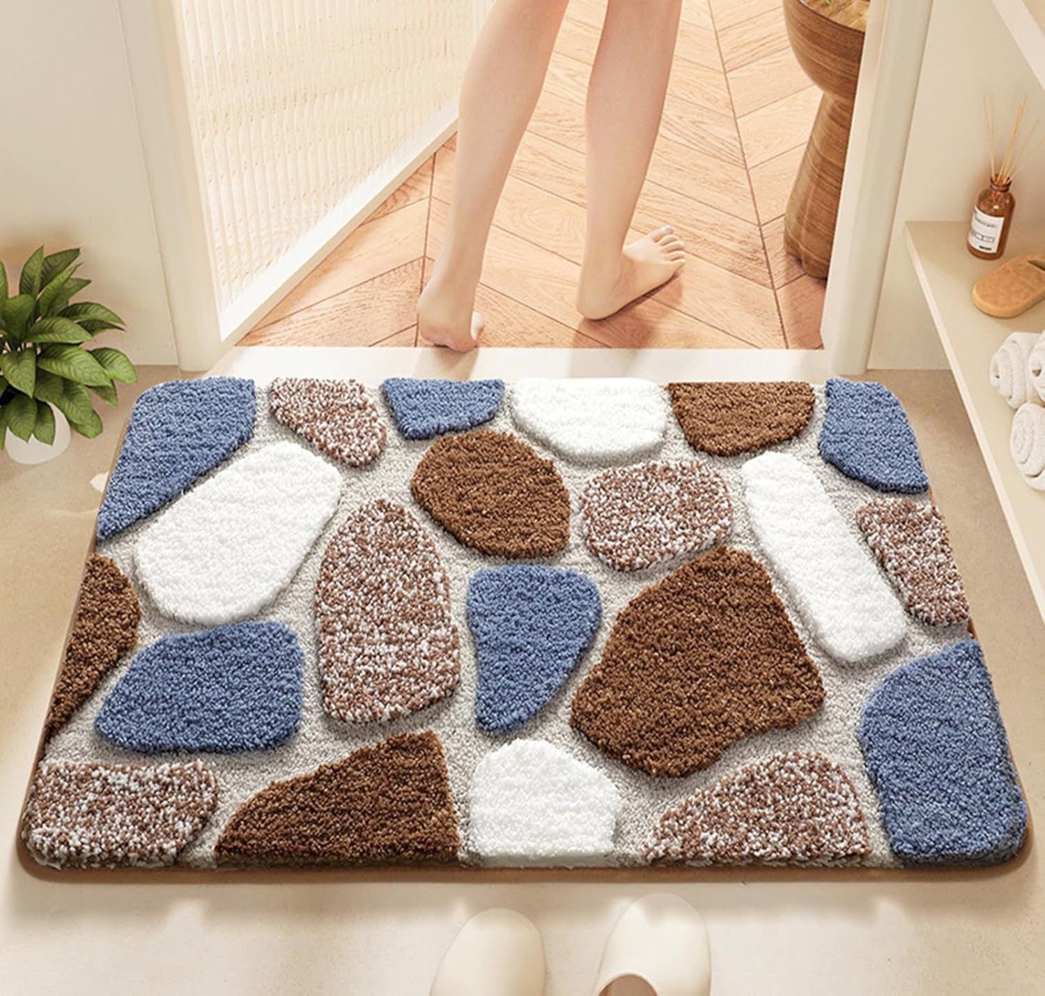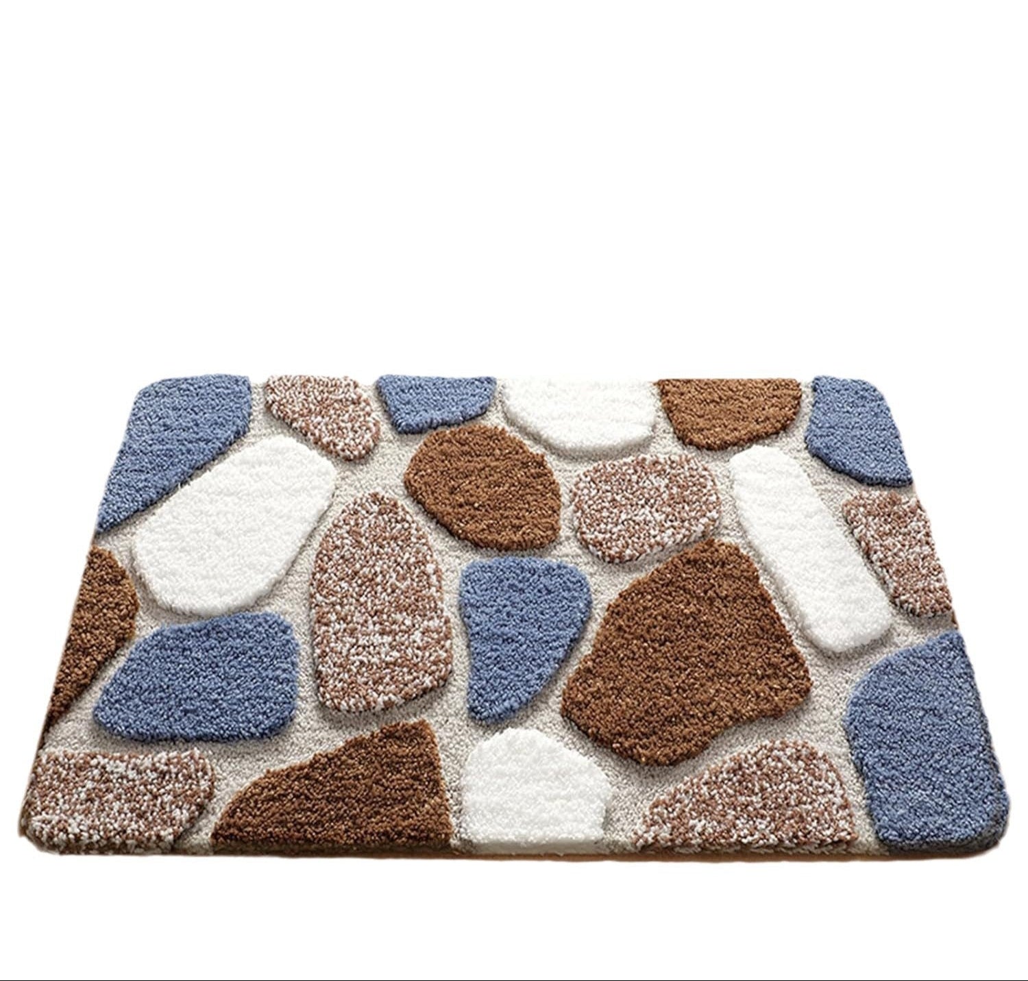 Eine rechteckige Badematte mit einem steinähnlichen Muster, die einen dekorativen Akzent setzt und gleichzeitig den Boden nach dem Baden oder Duschen trocken hält.