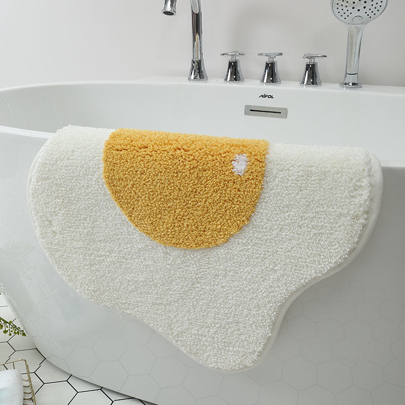 Eine Fußmatte in Form eines Spiegeleis mit einem gelben kreisförmigen Gestaltung in der Mitte, die Innenräumen wie Badezimmern, Schlafzimmern oder Eingangsbereichen eine verspielte Note verleiht.