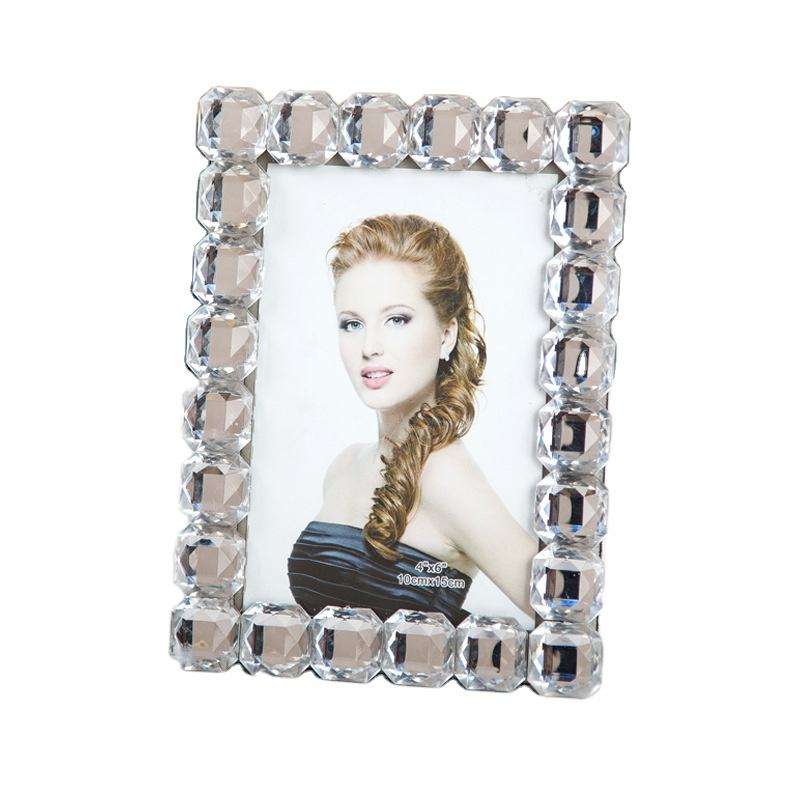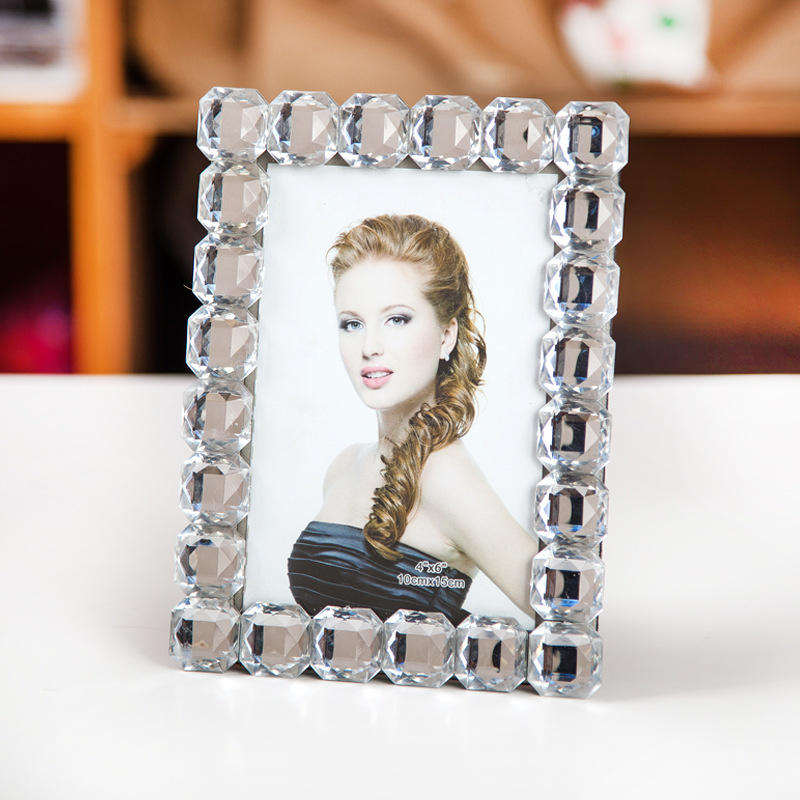 Ein rechteckiger Tischfotorahmen mit einem Rand aus facettierten, klaren Elementen, der zum Aufstellen von Fotos in Wohnzimmern, Schlafzimmern oder Büros konzipiert ist.