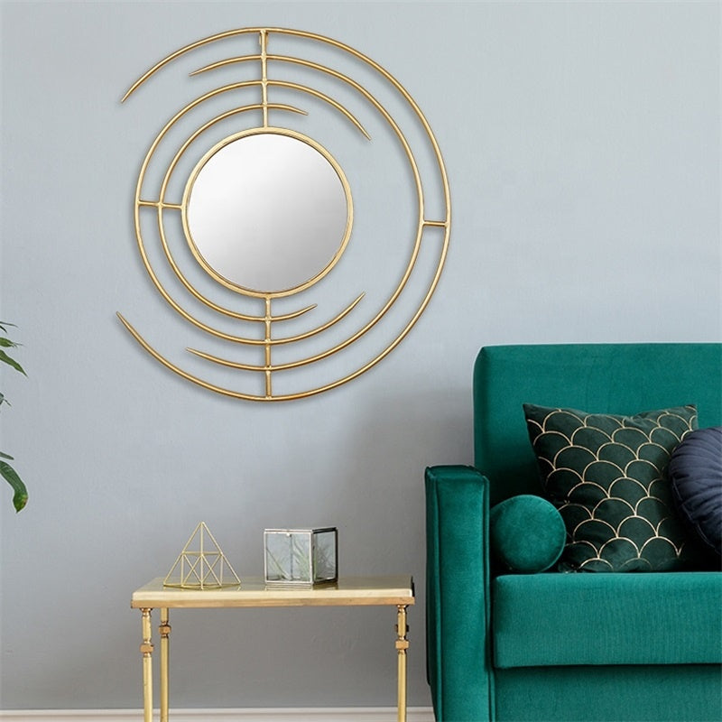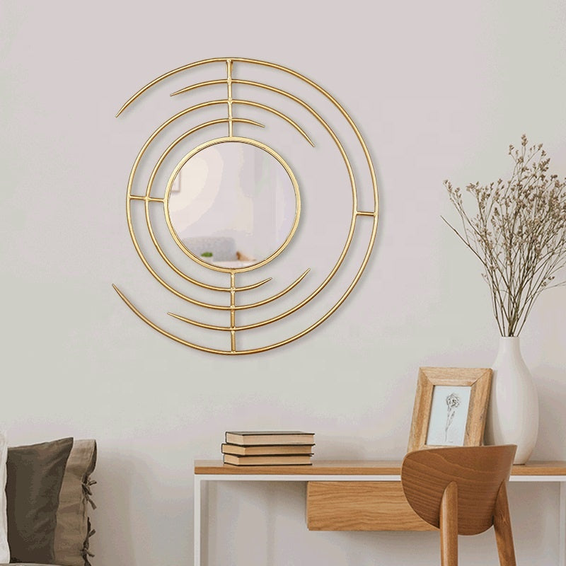 Dieser dekorative Spiegel hat eine runde Form, die von mehrschichtigen Metallbögen umgeben ist, und bildet einen auffälligen Blickfang für jede Innenwand. Er verleiht dem Raum visuelle Tiefe und passt perfekt zu modernen oder minimalistischen Einrichtungen.